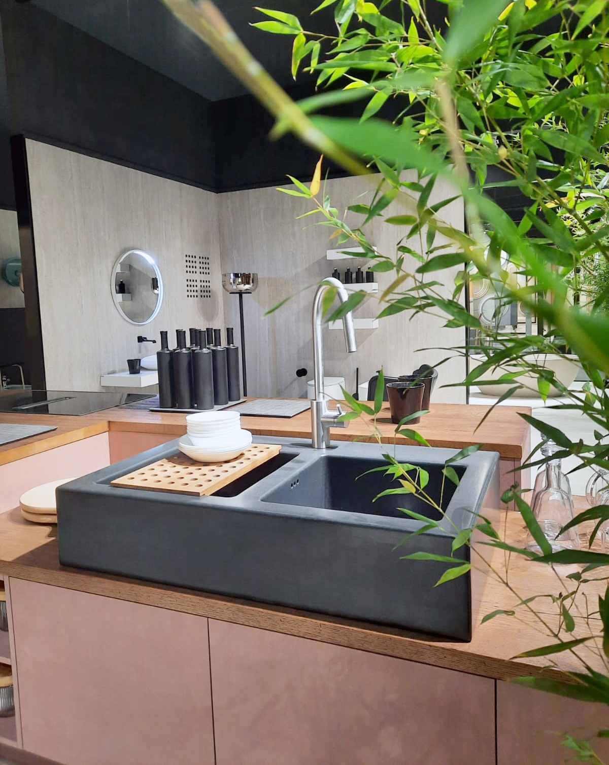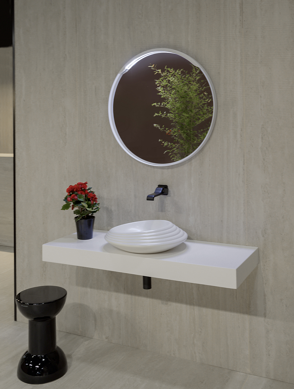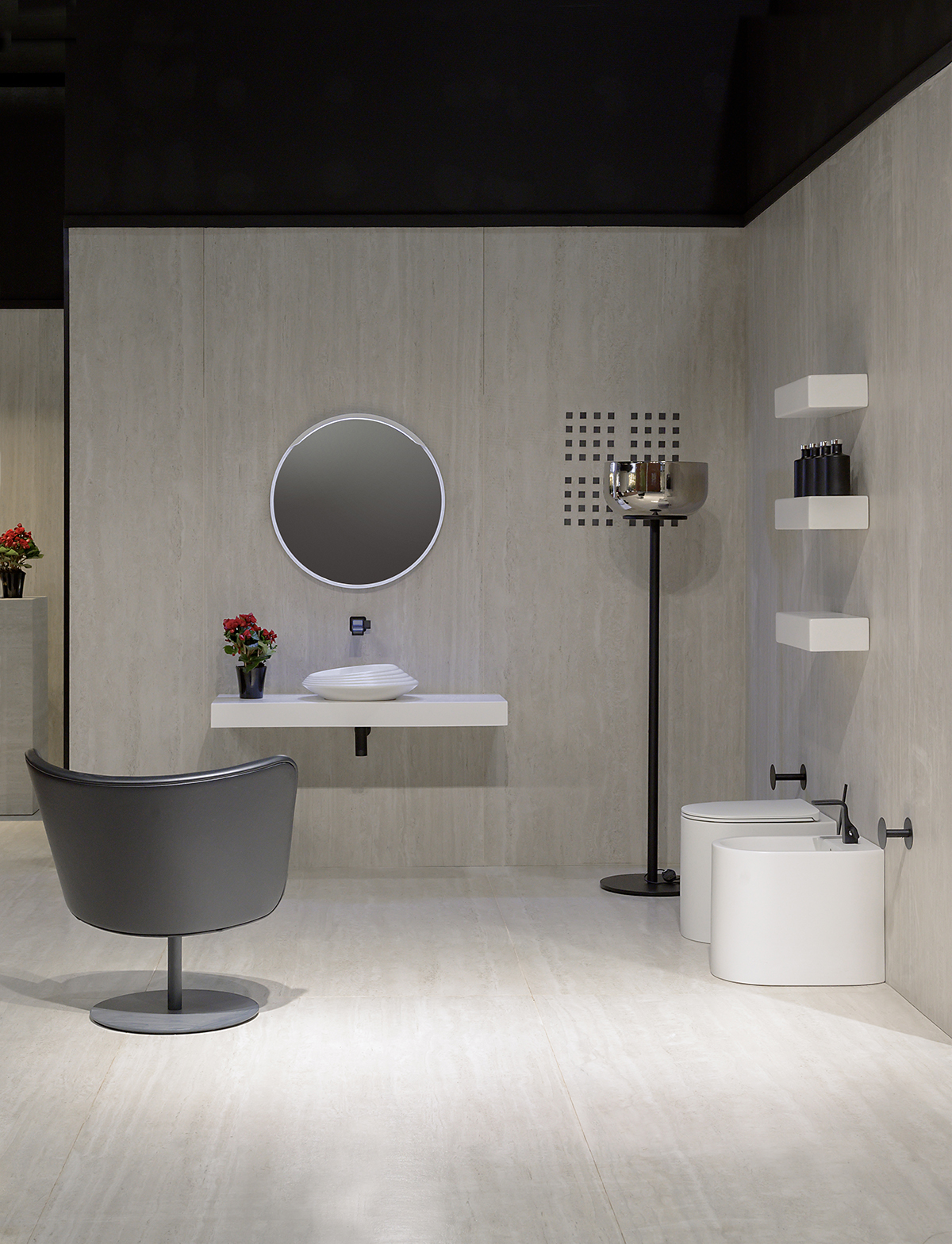 Il viaggio nell’universo dell’abitare ha spinto Flaminia a indagare anche l’ambiente cucina con un’area dedicata alla linea di lavelli Acquafood, proposto nella tonalità opaca Carbone che conferisce un nuovo aspetto volumetrico all’oggetto, e in una versione più definita rispetto al prototipo presentato in precedenza. L’ispirazione deriva dagli acquai ceramici del passato, ma rilegge quell’eredità in chiave attuale. Il dialogo tra innovazione tecnica e design si materializza anche nel sistema di risciacquo gosilent, evoluzione del progetto goclean, che oltre a facilitare la pulizia della superficie interna del vaso, garantendone la massima igiene, ne riduce la rumorosità. Gosilent, finora disponibile solo sui wc App sospesi, viene esteso anche all’importante collezione Monò, disegnata da Patrick Norguet.