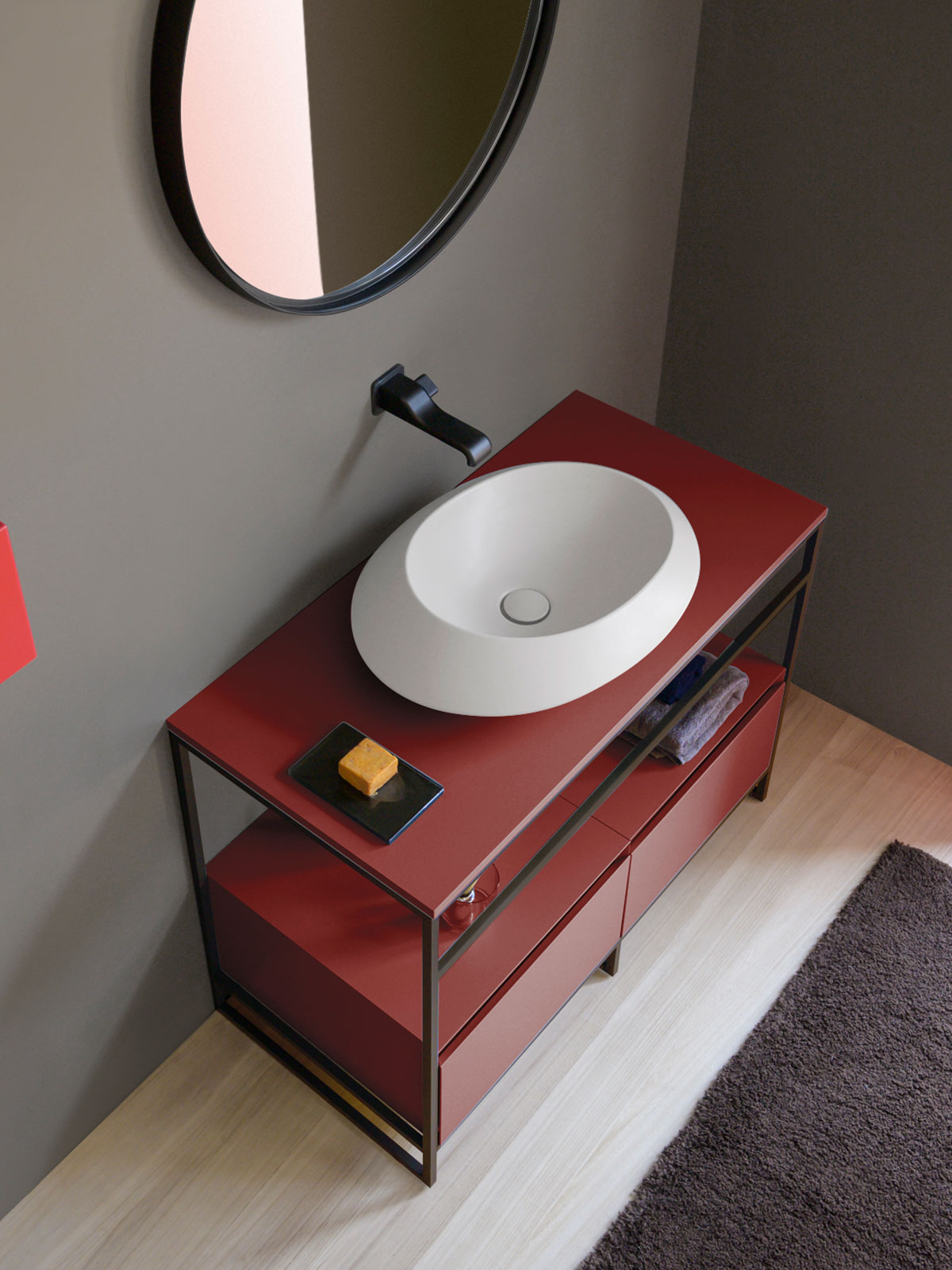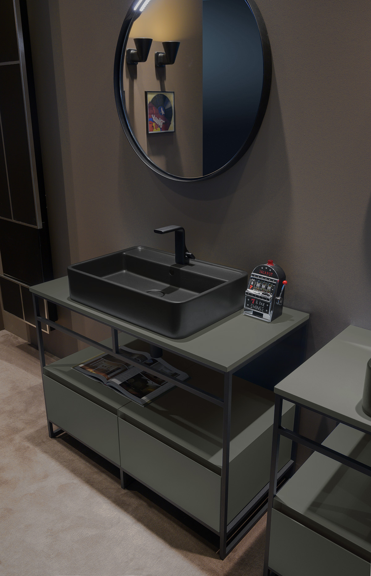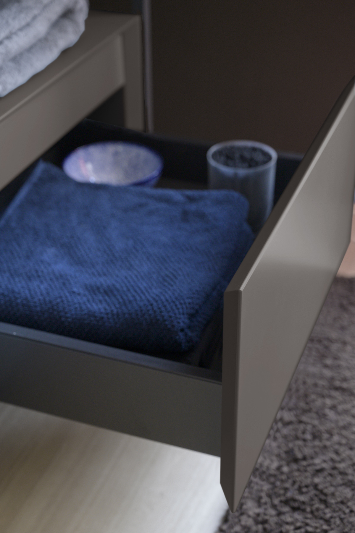 Denver è un mobile portalavabo composto da una struttura in metallo nero matt con barra portasciugamano, completata da top e cassetti in legno laccato disponibile in diversi colori.