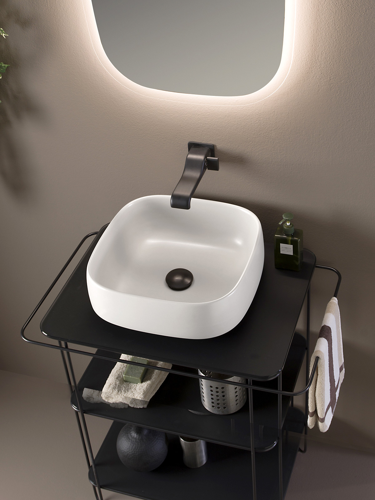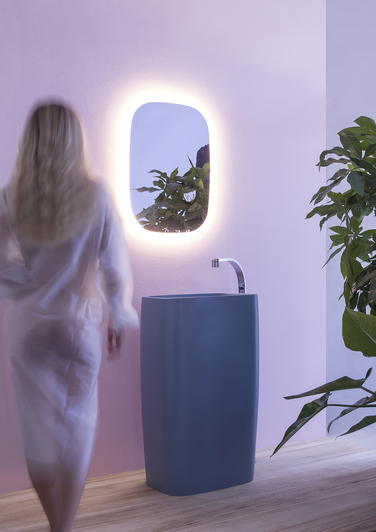 Flag è una collezione di sanitari e lavabi ben articolata, completata da specchi con illuminazione led.