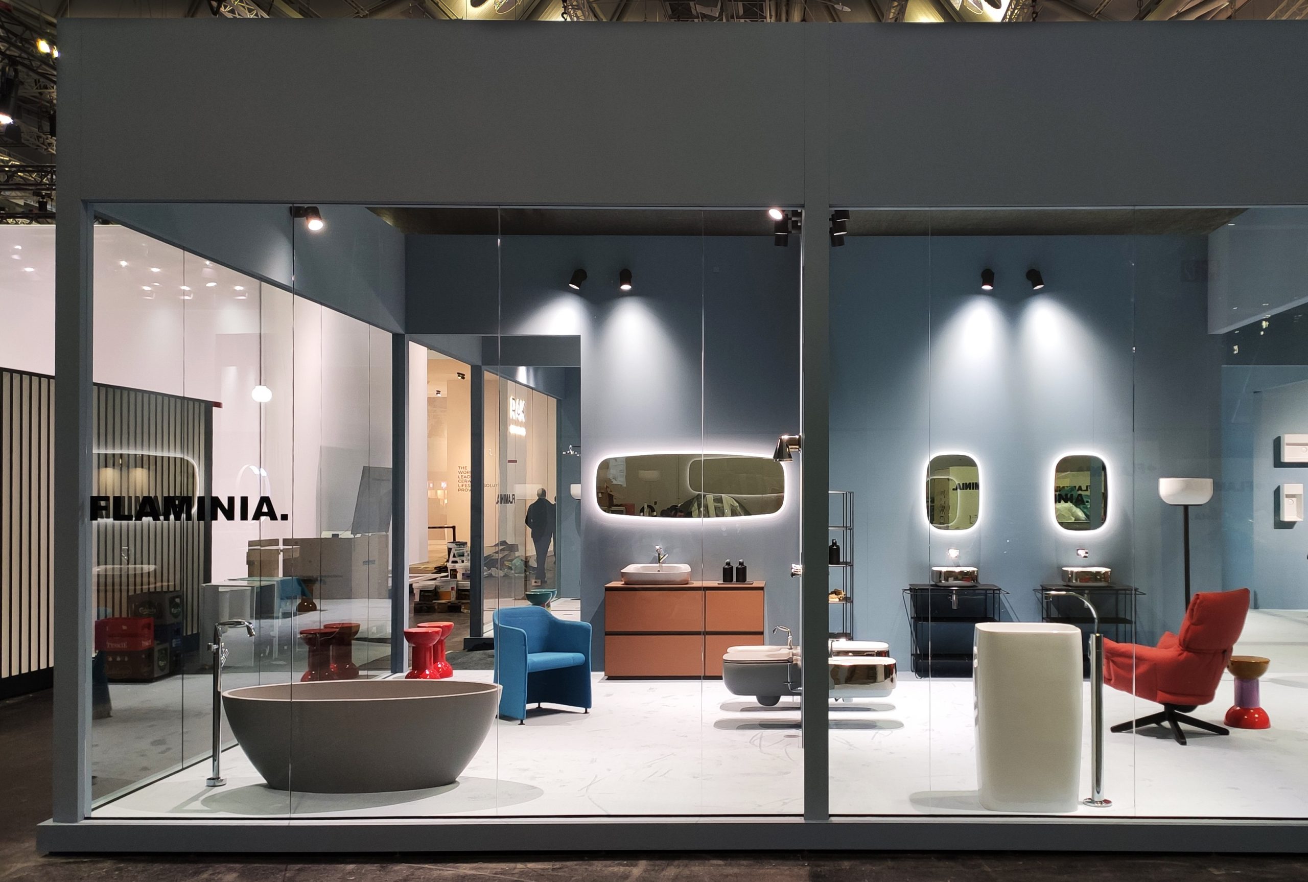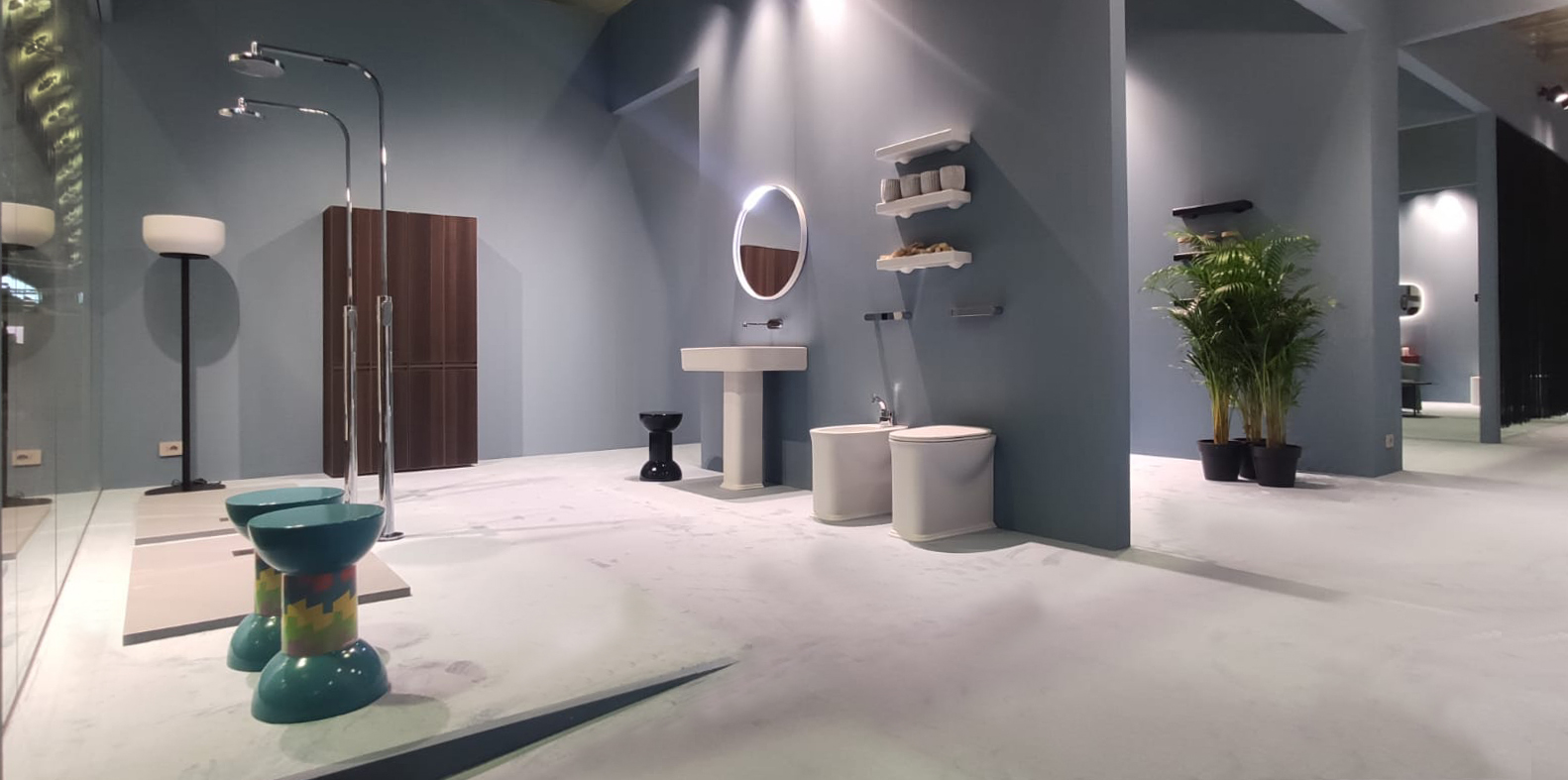 An azure container, hosting different bathroom environments that can be seen from the outside through large windows, is the concept of the stand designed by art director Giulio Cappellini.