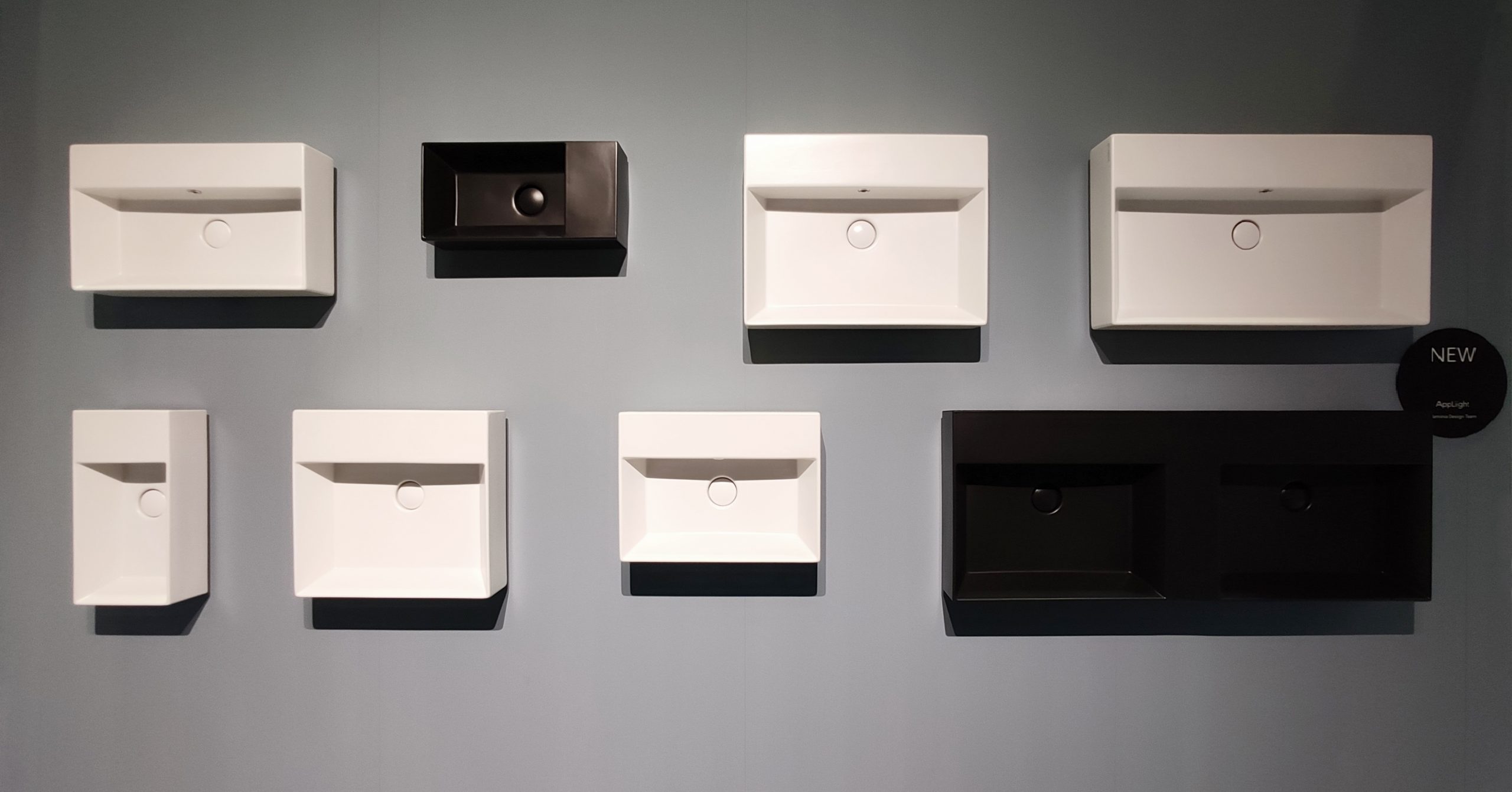 AppLight, the recently launched line of washbasins from the App collection, has acquired acquired two new models: a 120 cm wide double bowl washbasin and a reversible handwashbasin. Both models come with a tap surface, are suitable for wall and countertop installation, and can be had in various colours: Latte, Carbone, Uva and Menta. Cubika storage units, Denver and Filo washbasin stands, and Lux, Make-Up and Saltodacqua lamps round off the display.