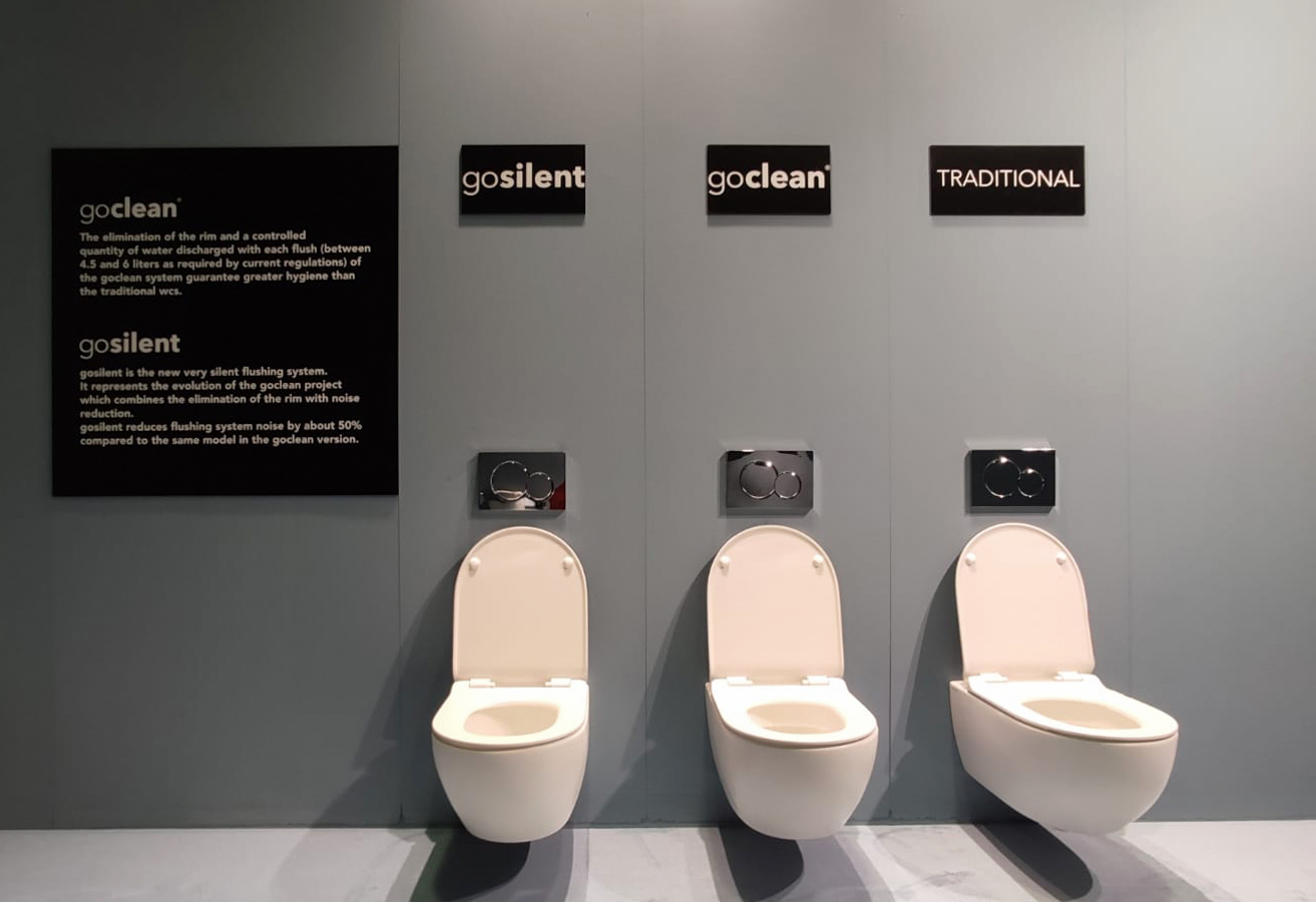 A major area is devoted to technical innovation. The company’s ongoing research endeavours find expression in the innovative gosilent flushing system. The new system applied to the App and Monò toilet bowls is a further development of the goclean project. Besides the advantages of a rimless toilets, gosilent achieves a reduction in flushing noise of around 50 per cent compared to a goclean version of a toilet of the same model.