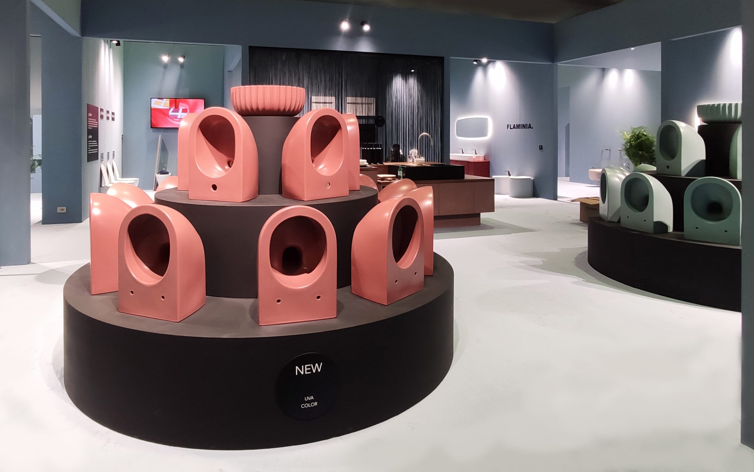 Experimenting with colours, an activity that has always been a hallmark of the brand, finds expression in two brand-new colours, Uva and Menta, drawing inspiration from nature. The new matt hues are presented on two huge circular installations that amplify their visual impact. The colour palette of the brand becomes more and more rich, ranging from metallic (Gold and Platinum) and silver finishes (Silver Black and Silver White) to matt finishes: Latte and Carbone, Argilla and Cenere, Nuvola and Fango, Petrolio and Rosso Rubens.
