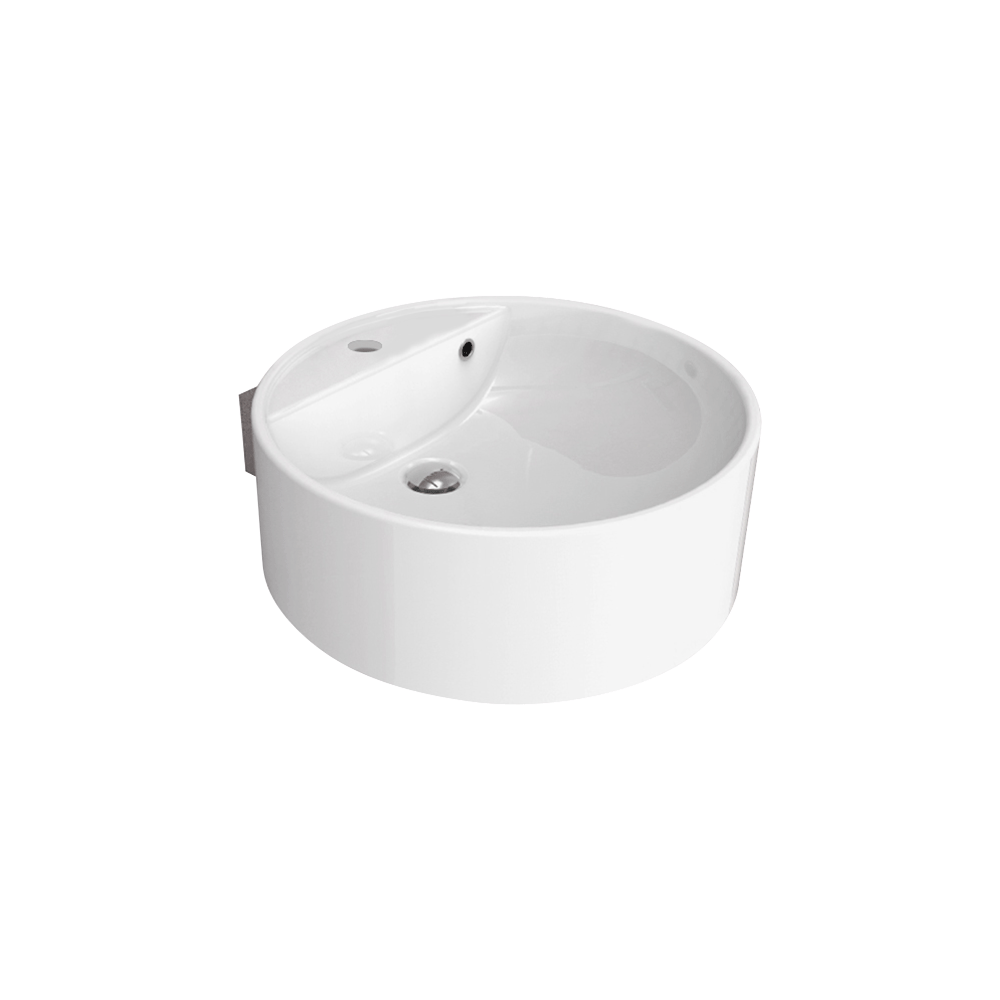 Lavabo cm 52, installazione sospesa tramite staffe, con piano rubinetteria monoforo e troppopieno.