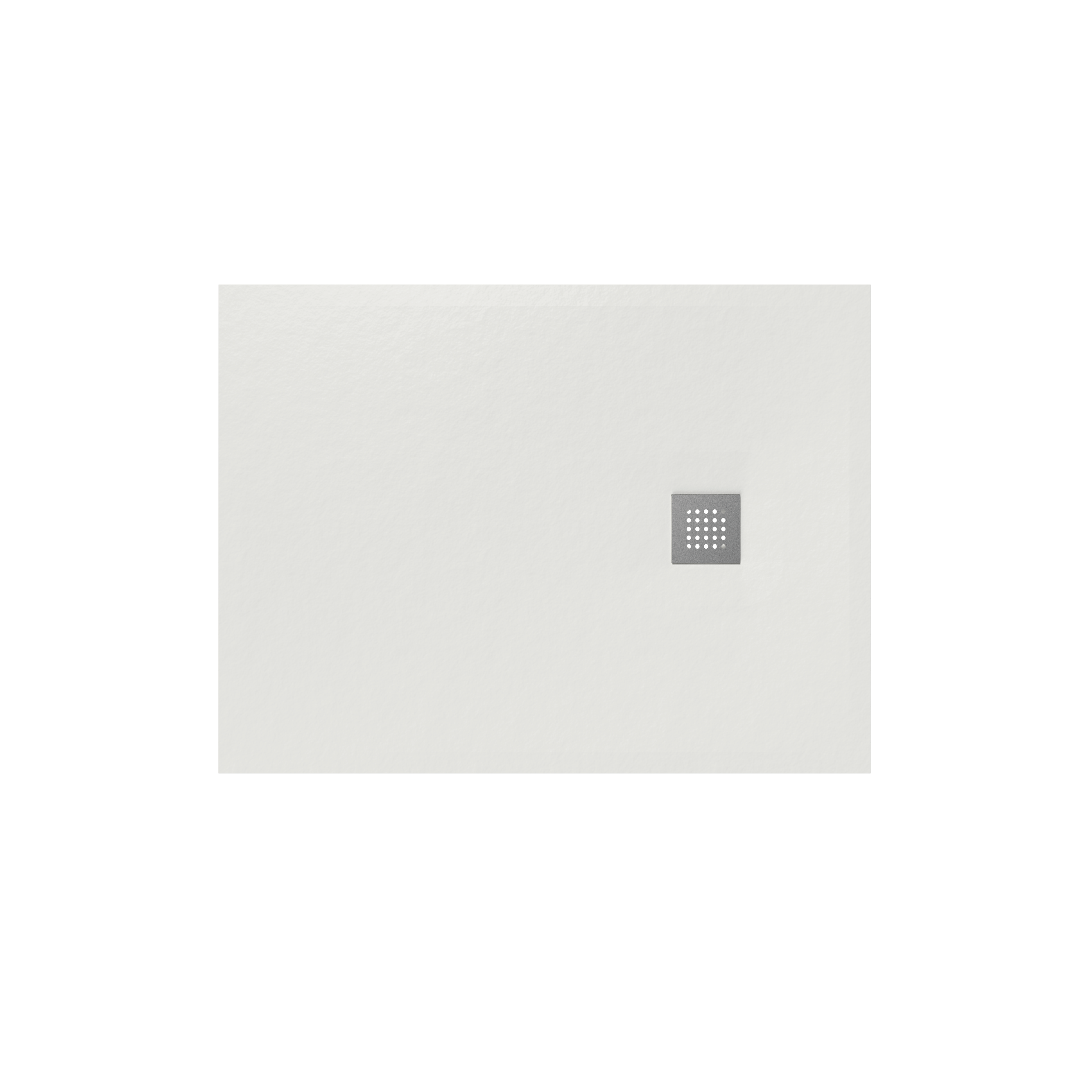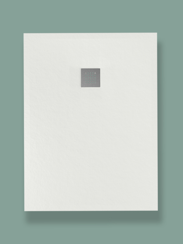 Piatto doccia in ceramica da appoggio/incasso filo pavimento cm 90×120 h3. Piletta sifonata ø 90 mm con griglia in acciaio inox spazzolato inclusa.