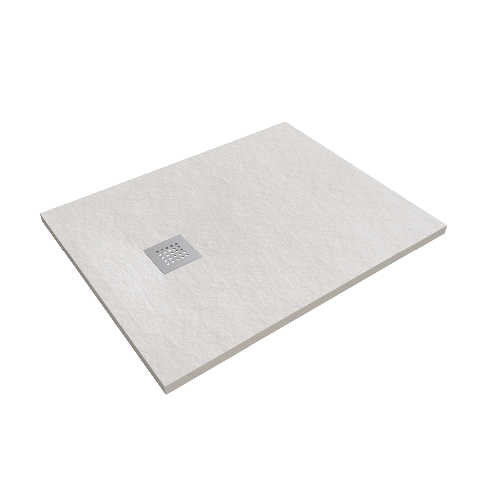 Piatto doccia in ceramica da appoggio/incasso filo pavimento cm 80×100 h3, finitura Stone. Piletta sifonata ø 90 mm con griglia in acciaio inox spazzolato inclusa.